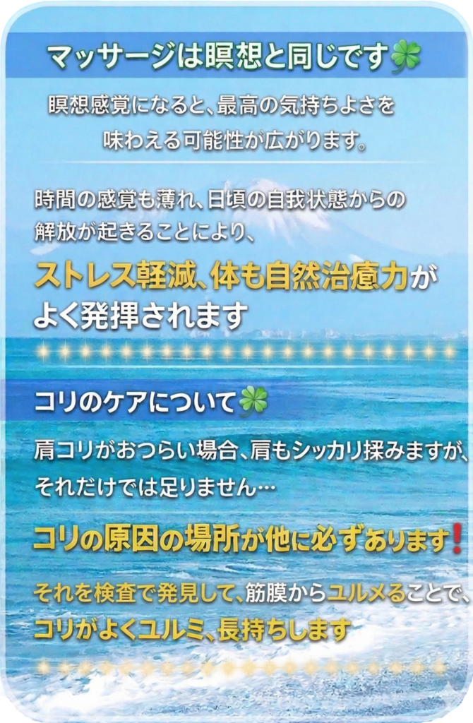 肩・腰ダルくて重かったのがウソみたい! TVで話題の筋膜セラピー、もみほぐし、骨盤調整、足つぼ、整体ほかで症状改善 私の求めてた癒しってコレだった♪アロマオイル・リンパトリートメントで全身気持ちよくリフレッシュ
